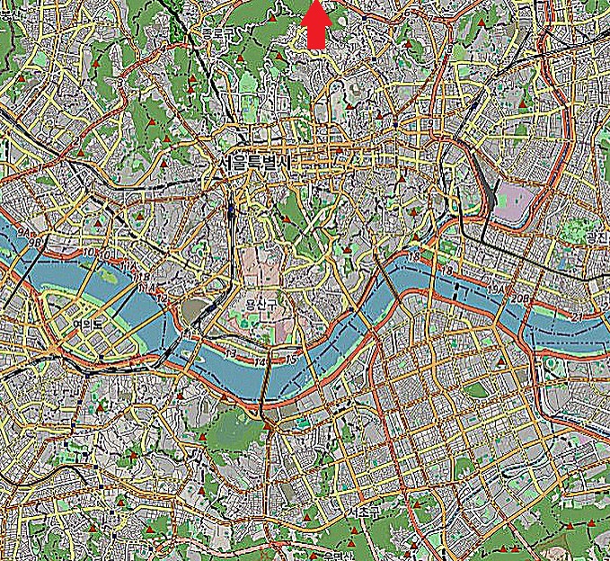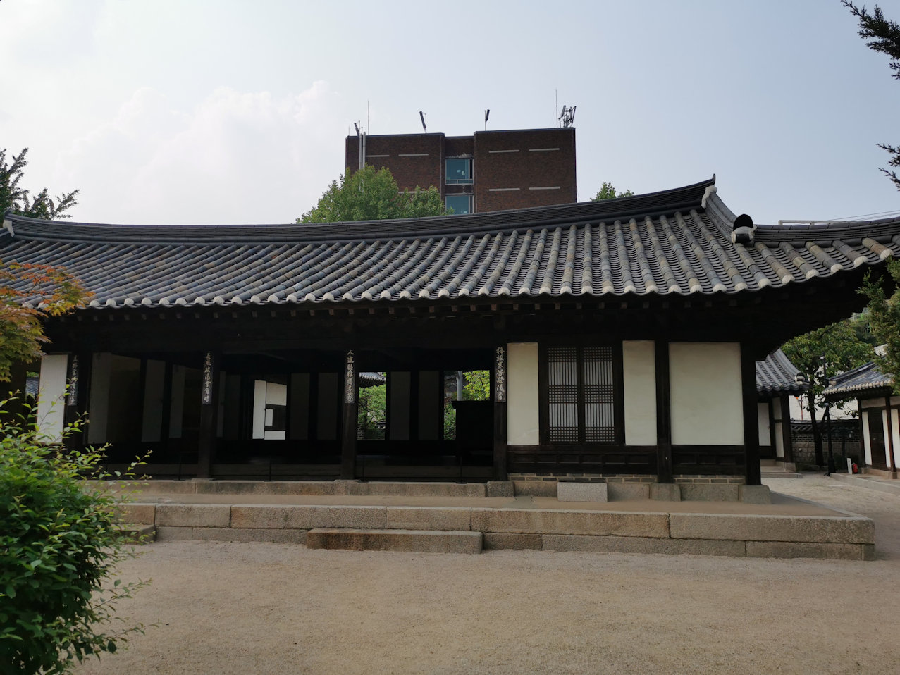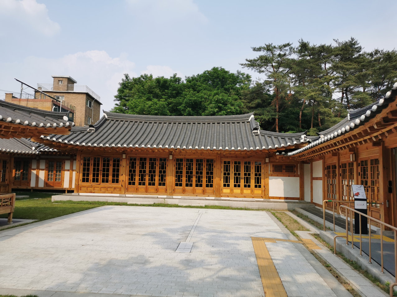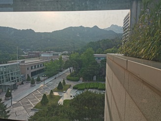 Vue d'une fenêtre de l'université sur le Bukhansan National Park • Maisons traditionnelles et musée, attenants à l'université Kookmin.