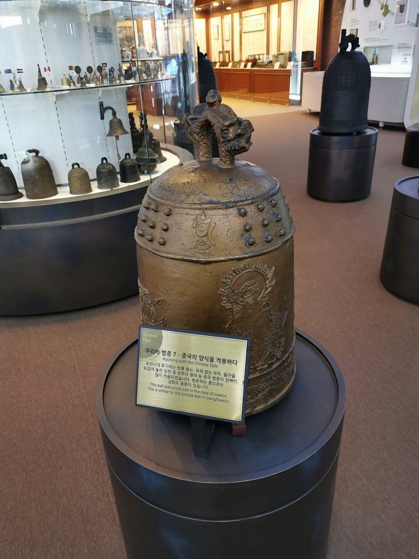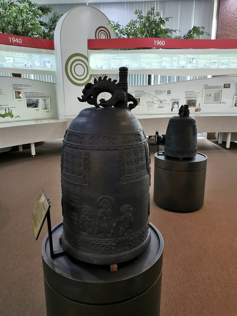 Au centre, la version au 1/10e de la cloche de 3,9 m de haut, 2,3 m de diamètre et de 23,6 tonnes, offerte à l'expo Daejon par la sté Chong Kun Dang en 1993.
