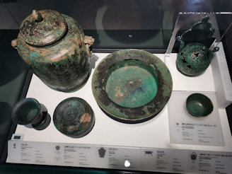 À gauche : Bronzes (boîtes à encens, brûleur, bol, pot)