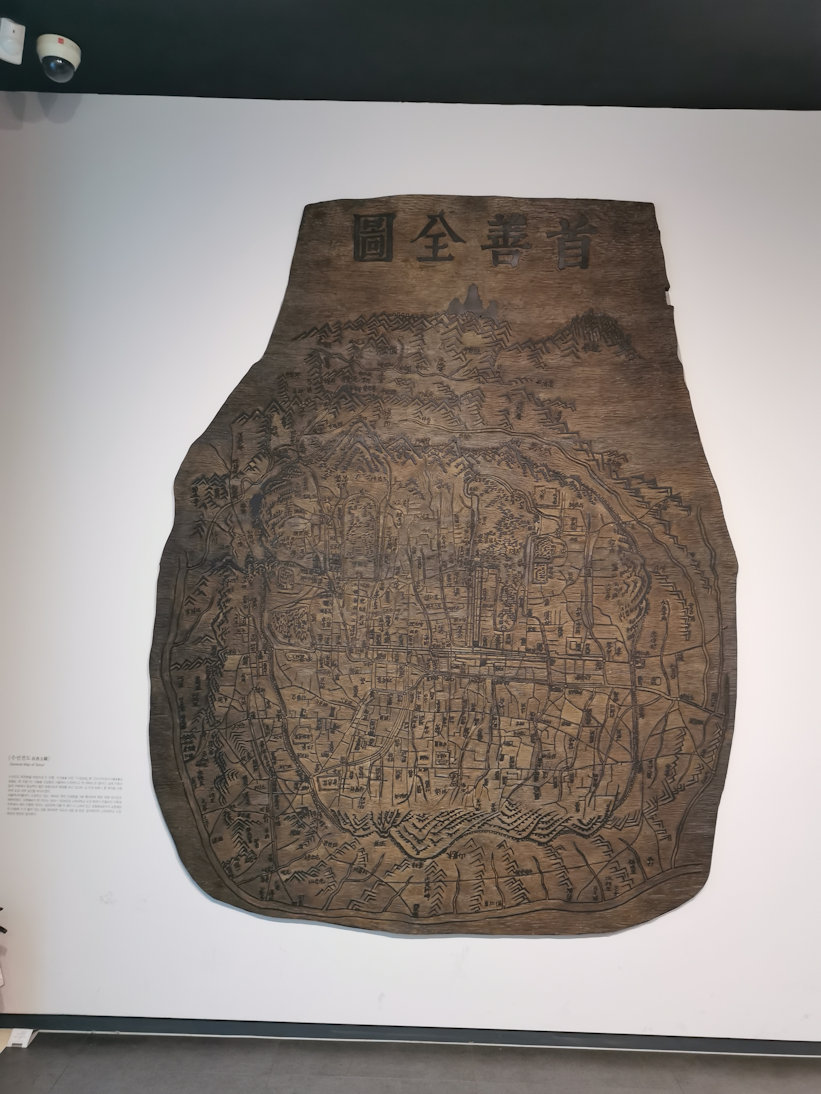 Au centre, le "Donggwoldo", carte de la ville du début du XIXe siècle (trésor national du Musée de l'université de Corée) montrant les palais Changdeokgung et Changgyeonggung avec les administrations scientifiques de l'époque (pluviomètres).