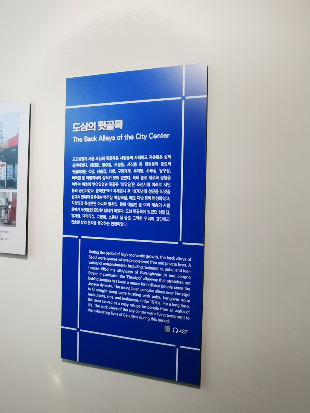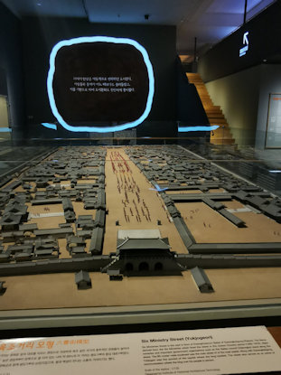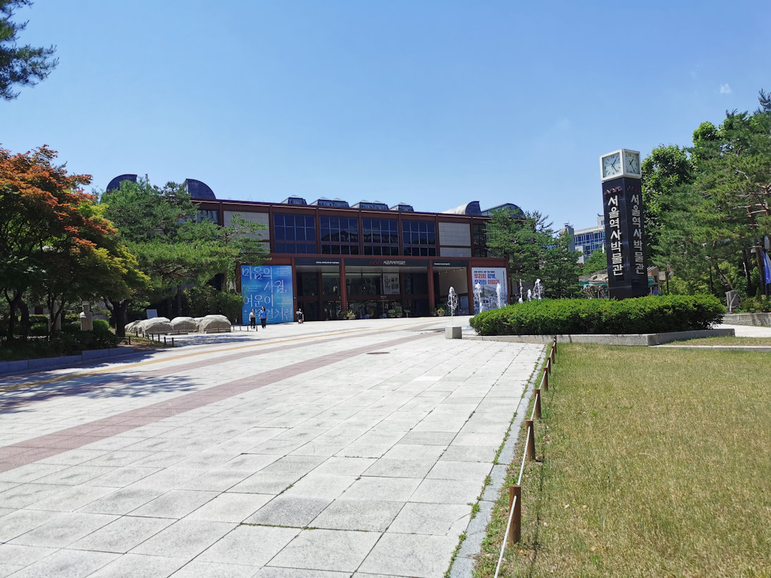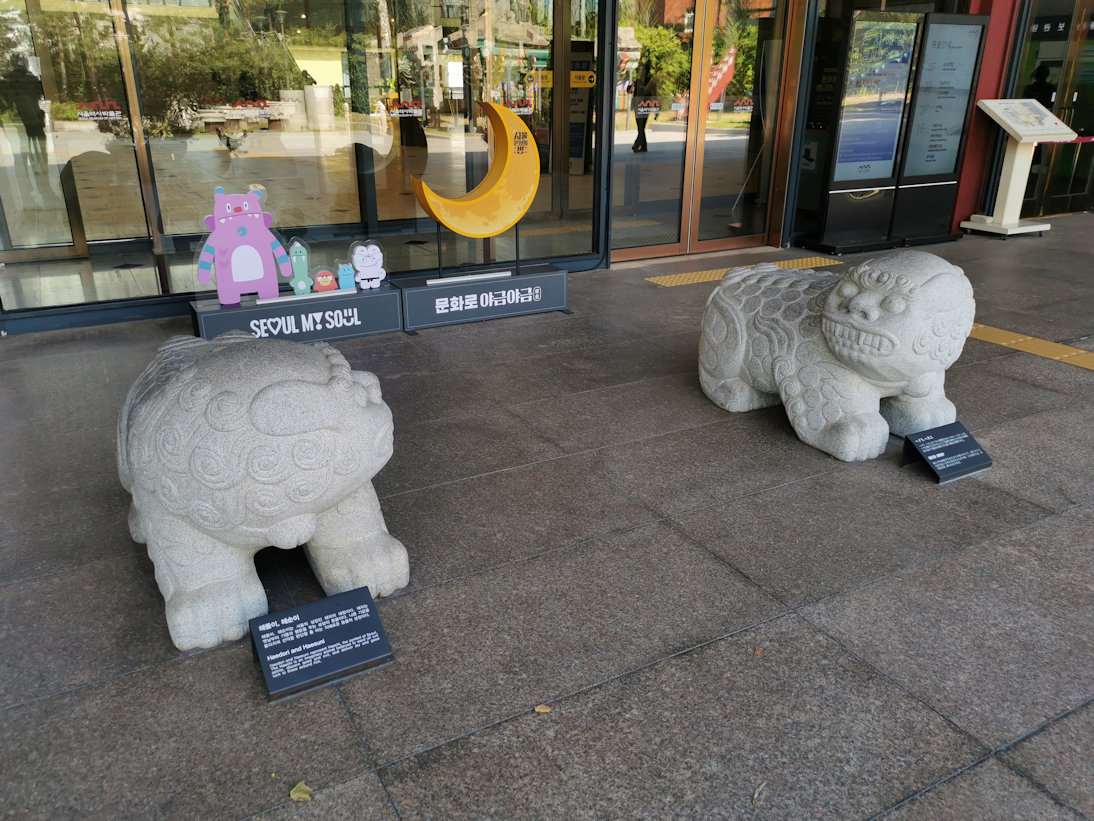 Extérieur et entrée du musée, avec Headuri et Haesuni qui représentent Haechi(symbole de Séoul qui protège contre les mauvais esprits, distingue le bien du mal et apporte la joie - figurine équivalente en rose derrière).