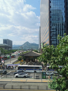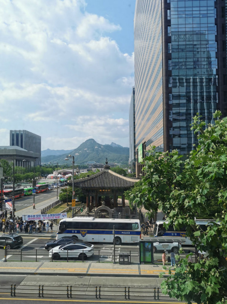 Vue de l'étage sur le palais Gyeongbokgung au loin (et une manifestion anti-woke au premier plan).