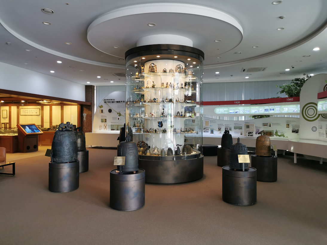 Au centre, la version au 1/10e de la cloche de 3,9 m de haut, 2,3 m de diamètre et de 23,6 tonnes, offerte à l'expo Daejon par la sté Chong Kun Dang en 1993.