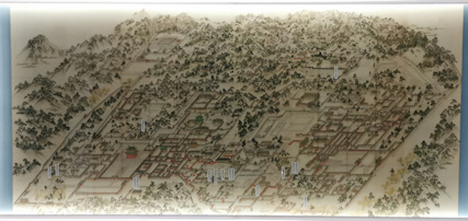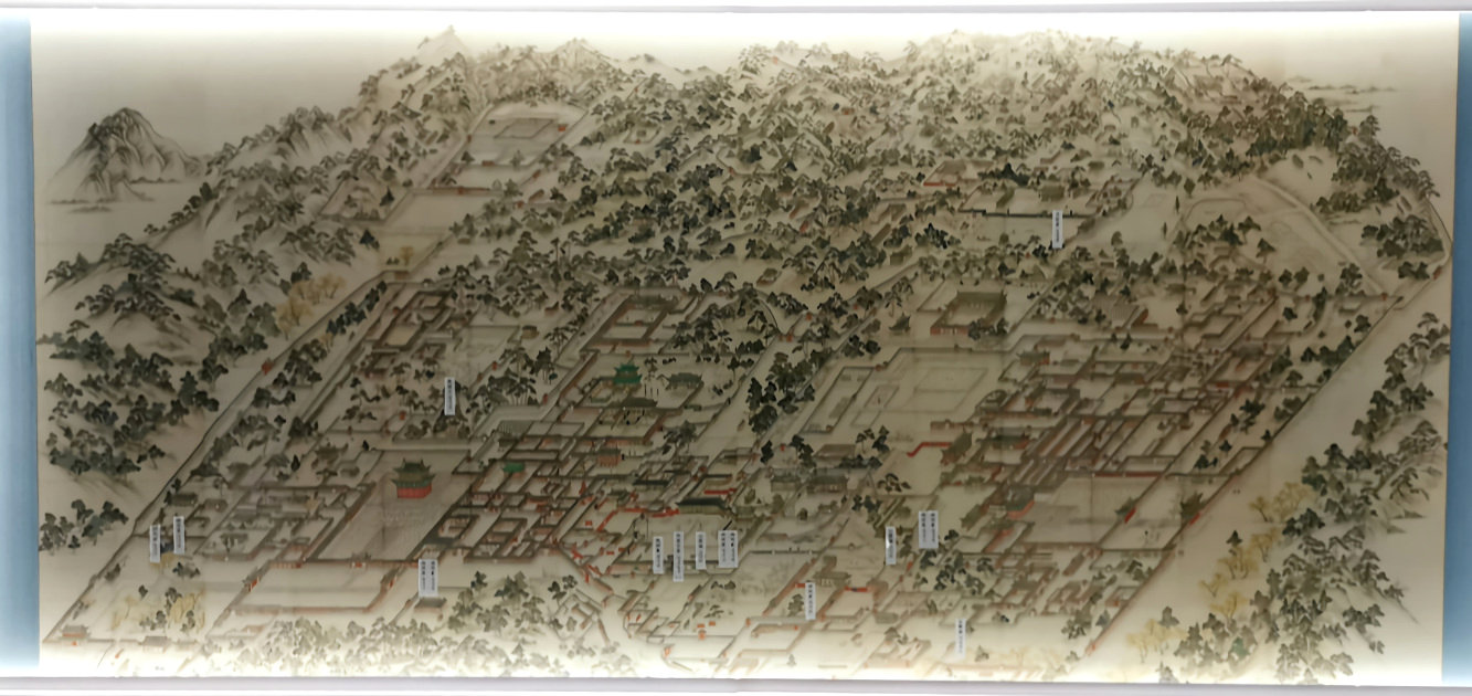 Au centre, le "Donggwoldo", carte de la ville du début du XIXe siècle (trésor national du Musée de l'université de Corée) montrant les palais Changdeokgung et Changgyeonggung avec les administrations scientifiques de l'époque (pluviomètres).