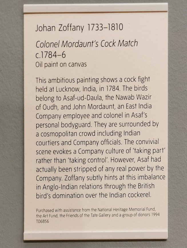 • Colonel Mordaunt's Cock Match (1784-1786), par Johan Zoffany (1733-1810).